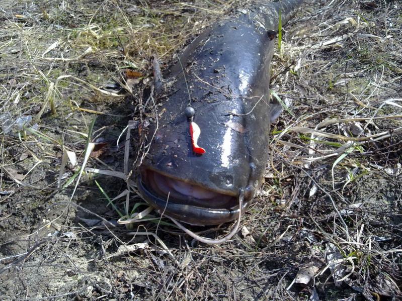 Помог ребятам достать сомика , как потом говорили вроде 24,5 кг весу зверь канечно зачётный:o , по расказам один товарищ его зацепил но после некоторого времени у него случился обрыв , после чего второй товарищ пуляет резинку и заворачивает оборванную пленю первого и понеслась:D перебрасывание спининга через канавку куда монстр туда и рыбак, в итоге припёрли этого демона к берегу а взять не могут забагрен за хвост а длинна больше метра и головой упирается в дно а хвост скользкий не взять берег обрывистый , пригодился мой разложенный подсак., завёл голову в подсак и поднял тут его и приняли под жабры.Теперь я точно знаю если пошить туфли из сомовьей шкуры им сноса небудет:mrgreen: