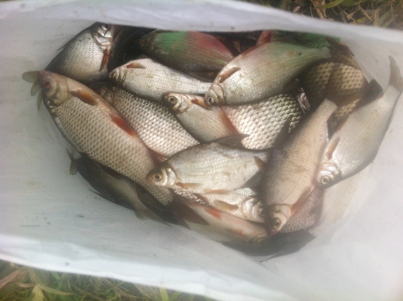 В 9-30 полетела первая кормушка 50 гр, и довольно быстро покатилась вниз по течению и поклевка- густерка ладошечник, след заброс похожая ситуация. Решаю менять кормуху ,вешаю фидер-спорт 84 гр, самой маленькой кормоемкости, как говорит Алексей Фадеев " На реке рыбу трудно закормить - основная наша задача это систематическая подача корма в одну и туже точку", так и решаю действовать. 84гр лежит почти уверенно на одном месте, наметил ориентир на противоположном берегу, и где-то после 7-8 заброса кормушки стали падать почти в одно и тоже место. До 10 было изловлено 4 густерки, два кокуня, и плотвичка. Потом начались строительные работы под новым мостом, пошла мутная вода, течение немного усилилось - и пошли поклевки на каждом забросе, рыба начала увеличиваться в размерах, и где-то в 11-11:10 впервые замочил подсак(подлещик 250-300гр), потом ещё одного брата, и после 12 клёв пропал, до 13-30 поймав 2густерки 2 окунька. Начинаю думать что делать, благо рядом ловил Юра Бойко(yura_Brest) проконсультировавшись с ним решил удлинить поводок до 80см, диаметр 0,1 крючок 16. И жизнь заиграла новыми красками а точнее плотвой от 100 до - 300гр(самая большая), и раз в полчаса подлещики-близнецы первых двух, изредка окуньки. Веселье продалжалось до 16-10, а потом рыба куда то пропала, начал пшикать дипами, менять мотыля то 1, то 2, то пучок, то с пинкой, просто пинка, просто опарыш, за полчаса это ни к чему не привело. Решил собираться, в садке оказалось 4240 кг рыбки, которые были максимально быстро доставлены в одно небольшое озерцо - которое стараюсь зарыблять по возможности.