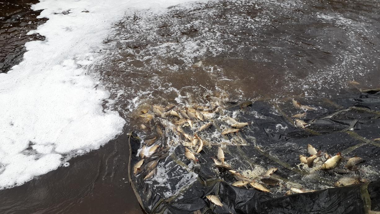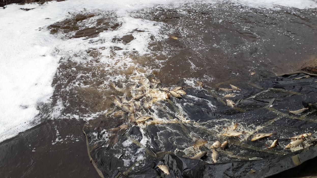 Место расчищается от камыша и береговой растительности которая может мешать ловить рыбу.Нас пригласили на зарыбление пруда карпом,при нас было зарыблено 1800 кг карпа весом от 180 гр до 400 гр,вчера было зарыблено карпом около 1500 кг и завтра будет выпущено на откорм примерно столько же,в общем около 6 тонн карпа. Думаю ,что с нулями никого не будет,в пруду остался карась примерно около 800 кг и карп(точной цифры в кг не помню:(). Со мной присутствовали наши форумчане,Маветан Эдуард и Саша Ахтунг. Была договоренность о тренировке, день тренировки я сообщу позже.