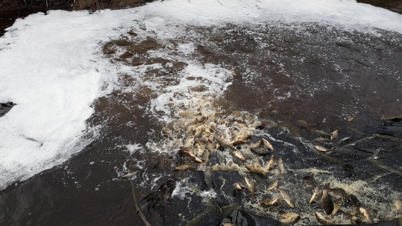 Место расчищается от камыша и береговой растительности которая может мешать ловить рыбу.Нас пригласили на зарыбление пруда карпом,при нас было зарыблено 1800 кг карпа весом от 180 гр до 400 гр,вчера было зарыблено карпом около 1500 кг и завтра будет выпущено на откорм примерно столько же,в общем около 6 тонн карпа. Думаю ,что с нулями никого не будет,в пруду остался карась примерно около 800 кг и карп(точной цифры в кг не помню:(). Со мной присутствовали наши форумчане,Маветан Эдуард и Саша Ахтунг. Была договоренность о тренировке, день тренировки я сообщу позже.