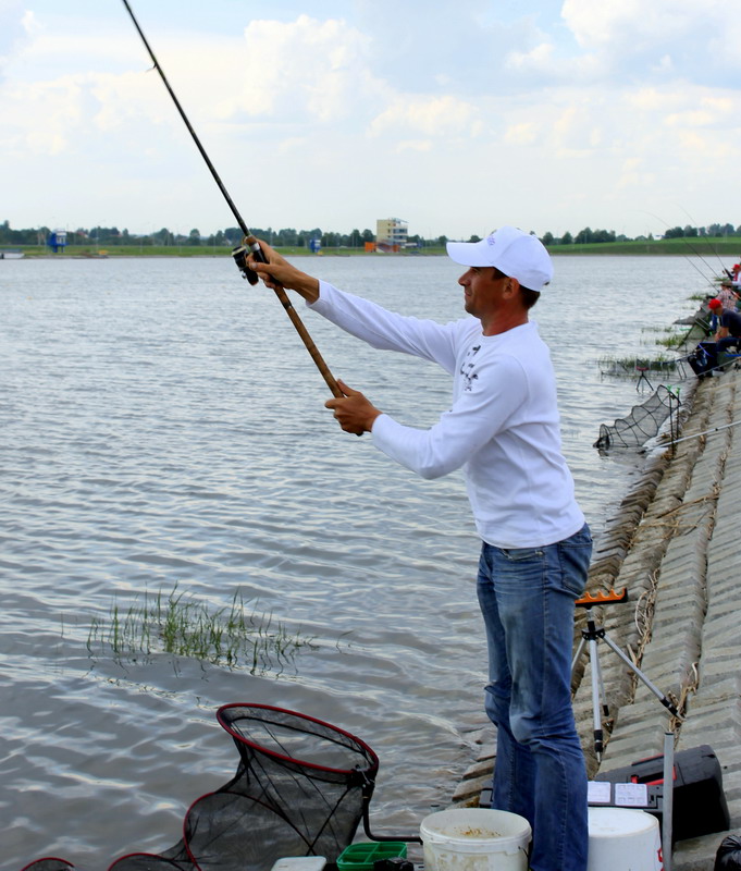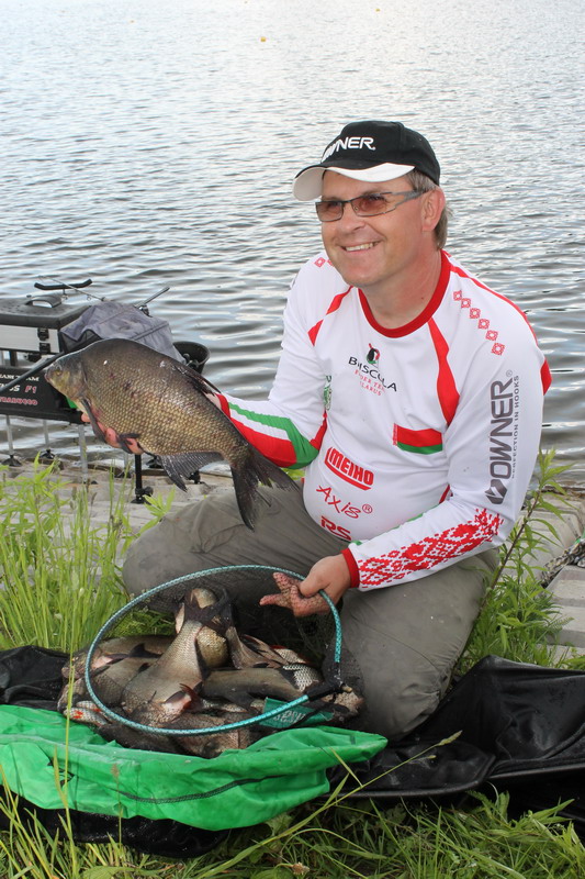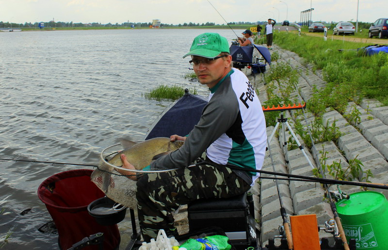 Участвовал в соревнованиях впервые, все понравилось, т.к. от нуля ушел и даже 33 место из 45 для меня достойный результат, в будущем буду стремиться к первым, но все это дело времени и приобритаемого опыта, фидер у меня самый бюджетный, да еще и трех метровый, кормился трапер вода стоячая, трапер голд, и не много мелассы белже и ванили, хотел добавить еще пару компонентов, но объездив магазинов 5 в Минске, ни где ни нашел, + мотыля в каждую кормушку. После первого заброса сразу клюнул мелкий подлещ, за ним окунек, а потом как обрезало, у соседа справа и слева поклевывает, а у меня нет. Начал перебирать поводки (длинее, короче), менял крючки, кормушки. И только при формировании грозовых туч на дальнем плане, начала проклевывать рыбка. Пробовал в качестве наживки опарыша, червя, но остановился на мотыле, т.к. на остальное у меня ни клевало.
