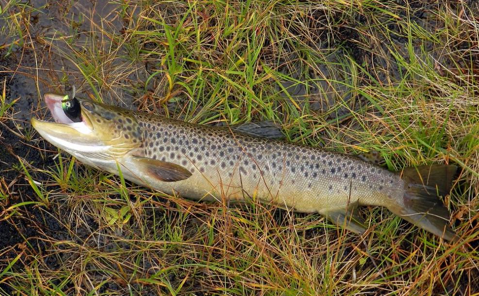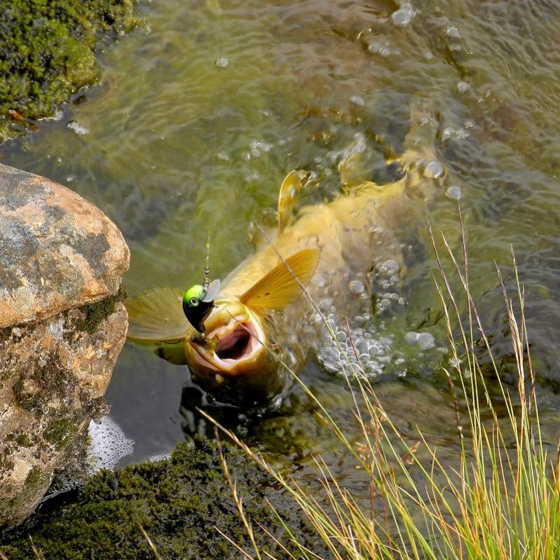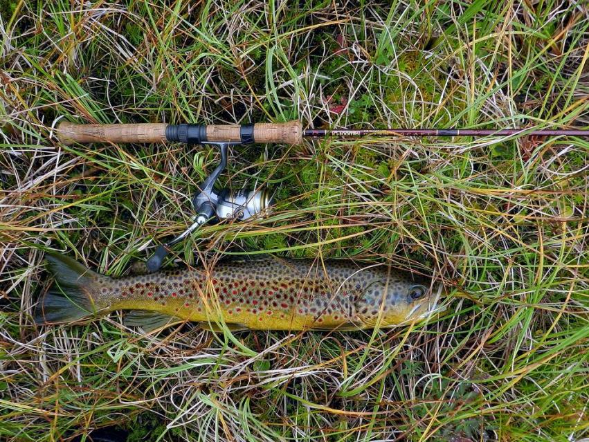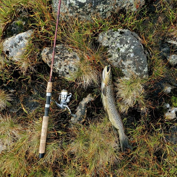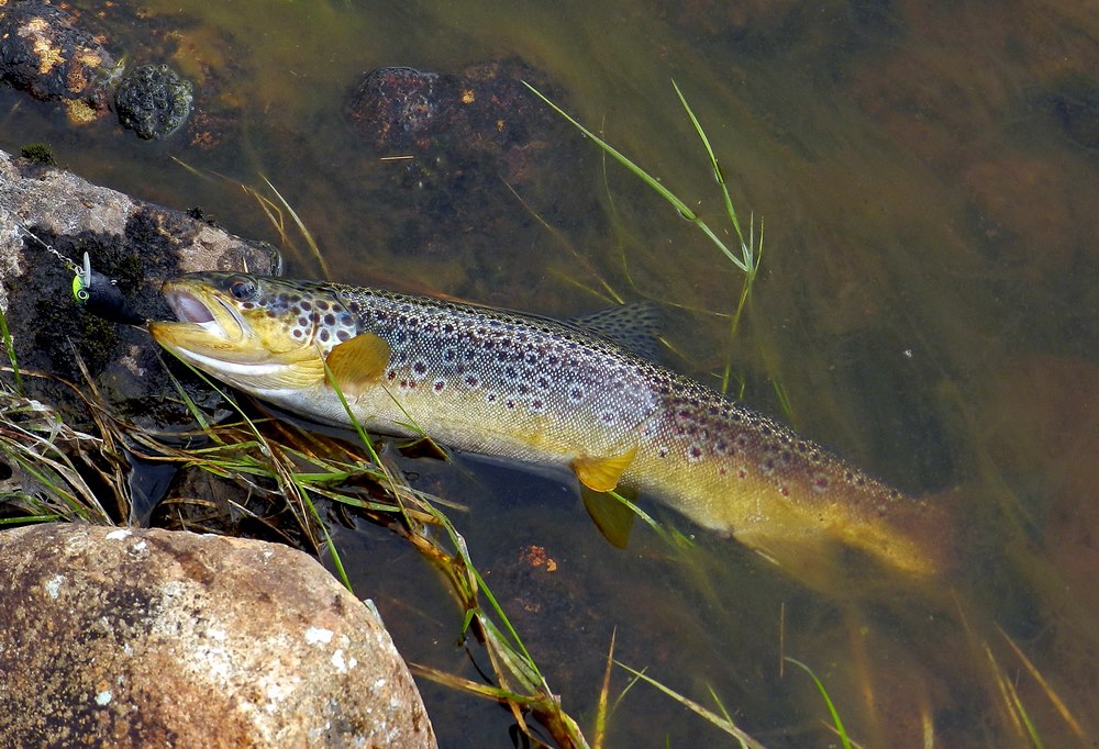 Я старался заметить рыбу раньше, чем она меня, приседал за травой на корточки, раскачивал как маятник приманку и укладывал ее прямо кумже перед носом, отпуск лески был всего 2-2,5 м, а фрикцион зажат.