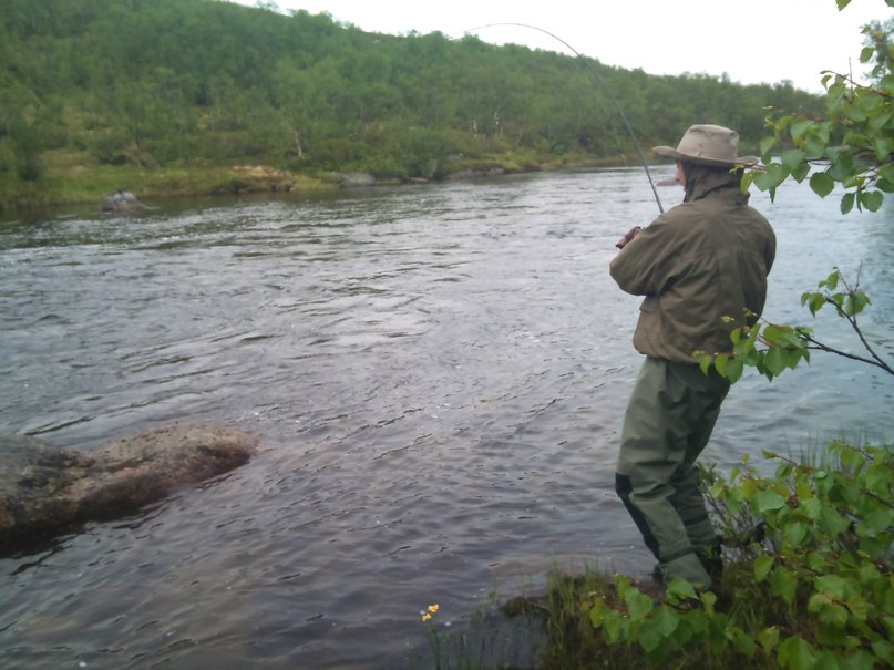 с 15.06 до 22.06 был на Кольском, на реке Белоусиха. на Кольском и вообще на лососевой рыбалке был впервые, поэтому впечатлений море!рыбалка просто офигительная! в первый же день на спиннинг поймал 3 семги весом 6кг, удача неимоверная!как обычно новичкам везет:)снасти были прочные, поэтому всех удалось победить:) леска была 0,33. после этого в следующие пару дней поймал еще 2 семги поменьше, килограмма 3-4. все это было в дождливую погоду, когда стало жарко, семга брать перестала и я переключился на озерную кумжу, в озерах ее достаточно много и берет на блесны активно. природа на кольском очень красивая, в месте нашей базы (12 км от Баренцева моря) тундра и лесотундра вдоль реки. база на р. Белоусиха прекрасная: постоянная горячая вода, электричество (от небольшой радарной станции рядом), баня, уютные домики и радушные хозяева. еда очень вкусная: постоянно была и кумжа, и семга, оленина, шашлыки, супы и всякие деликатесы. я всю семгу отпустил и только одну забрал. из нее сделали сашими, часть засолили, вкуснятина:)Белоусиха- река небольшая, 12 км, но на ней много хороших рыболовных мест и все можно обойти. еще плюс Белоусихи- до нее можно доехать на машине -150 км от Мурманска, часть дороги гравийная. населенных пунктов рядом нет, один поселок в 30км, жителей там чел 300, поэтому брэки рыбачить не мешают+реку охраняют. в общем отличная первая рыбалка на кольском, обязательно приеду еще. небольшой фотоотчет ниже. если кому интересно почитать про тур на Белоусихе, то здесь есть вся инфа http://t51.ru/.