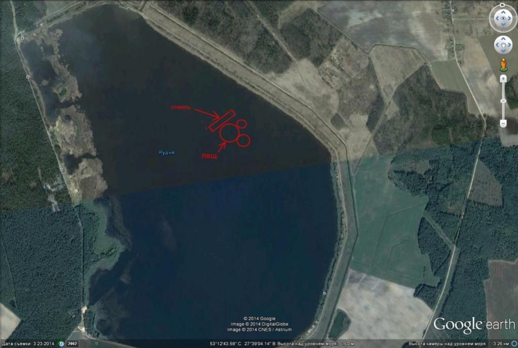 Были сегодня с Денисом . Облом полный - с 9-00 до 16-00 ни одной поклёвки , перепробовали всё что можно . Встретили вечером другой экипаж - у них то же самое , такое впечатление что хищник вымер . У поверхности грелись карпы , иногда заставляя оборачиваться на всплески . В привычных местах по эхолоту рыбы нет , на русле рыбы нет , на плато рыбы нет . Но всё таки удалось найти стаи лещей по пузырям - на воде полный штиль целый день , как зеркало . Лещ кормился большой стаей только в одном месте . На картинке примерно показал - слева от большой отмели , на плато глубиной 2,5-3 м , поросшем редкой травой . От берега - 100-150 м примерно .