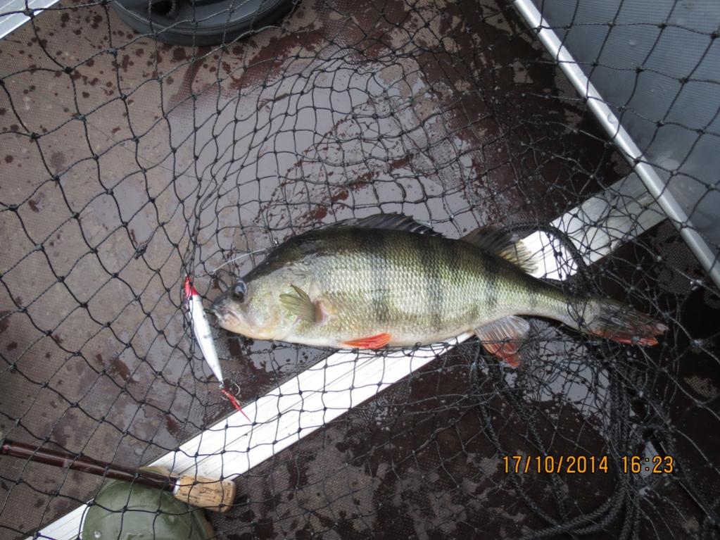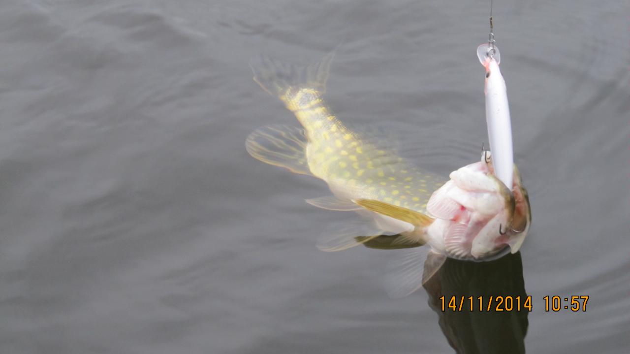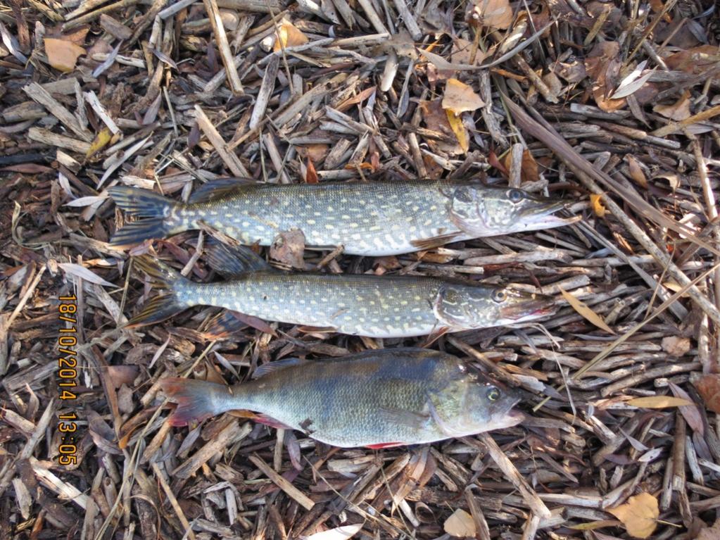 Третья и четвертая зачетные на кило и 1.4 кг, ну и под занавес бахнул окушек. В принципе все с одного места, сто на сто метров. В щуках была плотва, а окунек отправился в родную стихию подрастать.