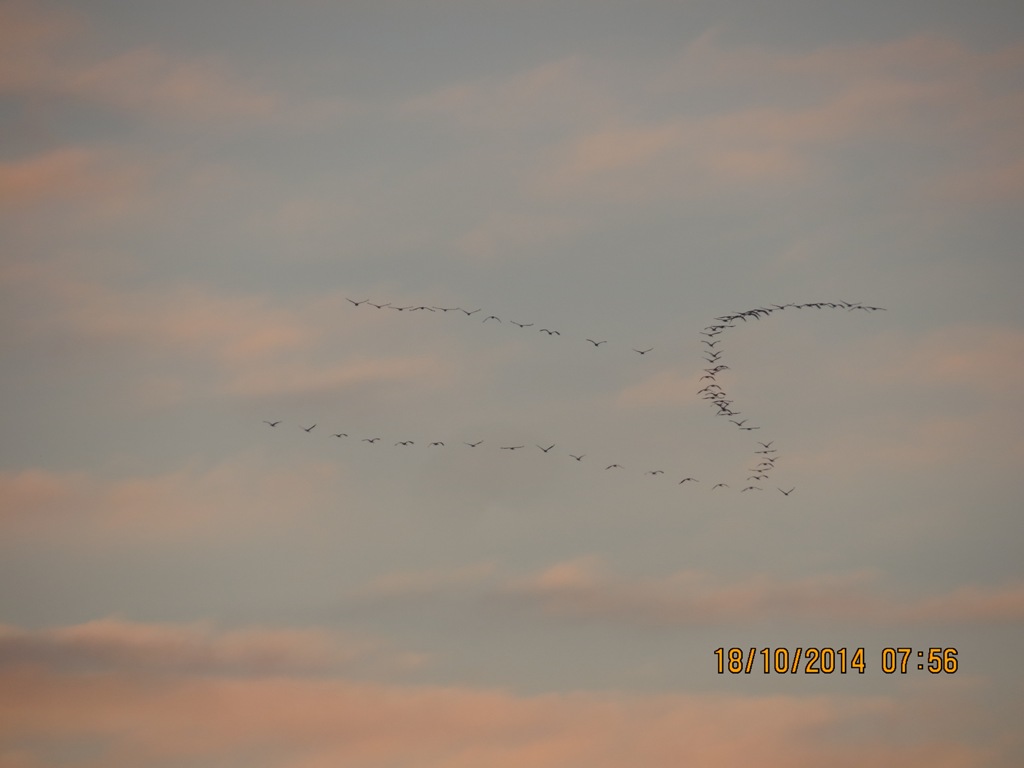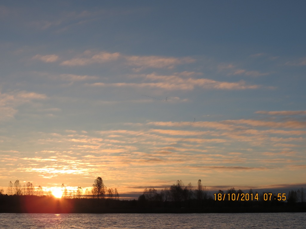 В утреннем небе , курлыкая , на юг потянулось два клина журавлей . Немного полюбовался ими и налёг на вёсла .