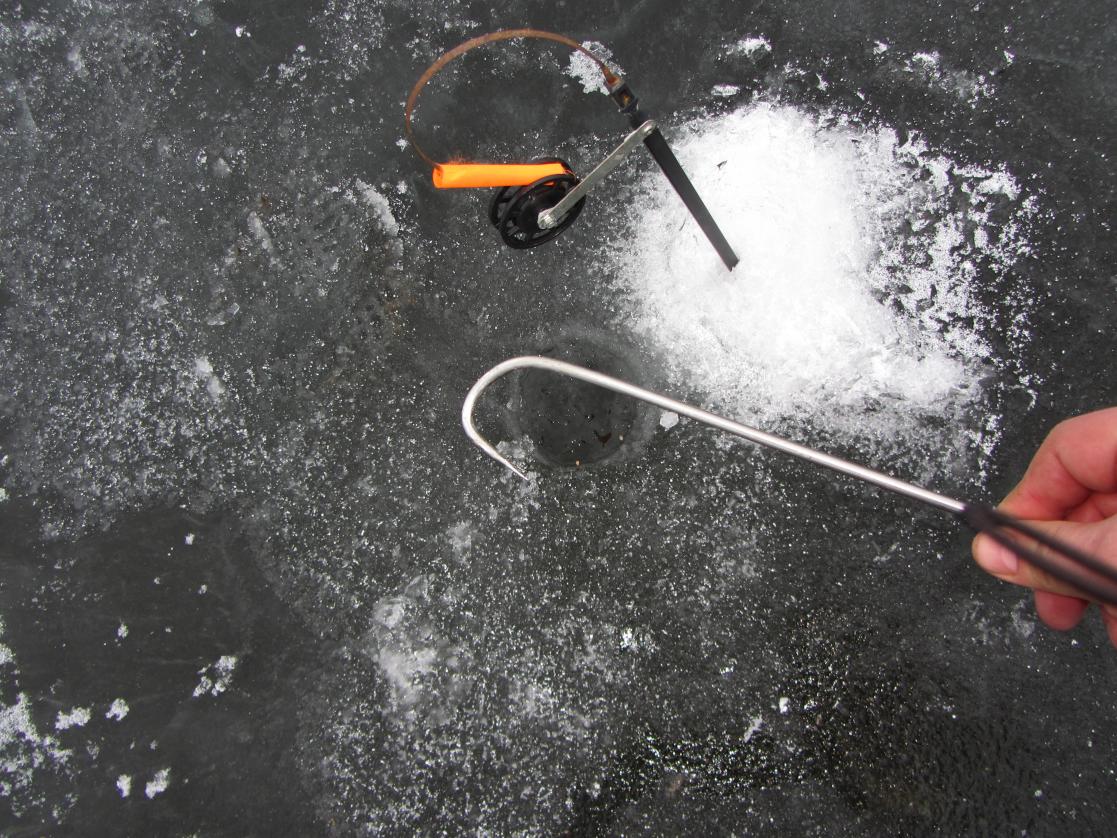 И вот к 8.30 первые дву поклевки. Одна —просто удар, вторая — килошница на льду.