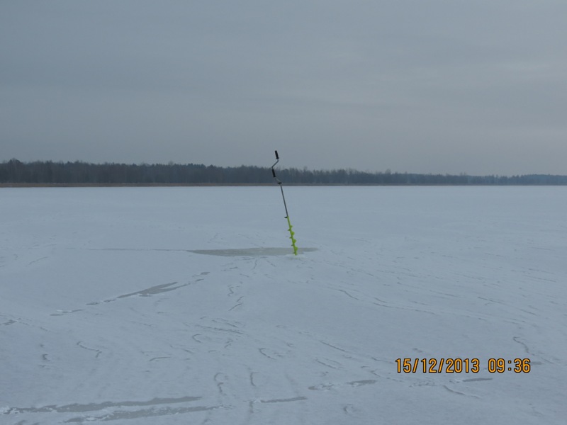 Сегодня выбрались открыть сезон твёрдой воды компанией из 3-х человек - Я , Володя "LosT" , Рома "ромик" . На водоёме были в 9-00 . Взору открылась белоснежная равнина с небольшой группкой людей на льду - значит лёд держит ! Смело двинулись вперёд . Роман остался недалеко от берега мормышить , ну а мы отправились подальше макать блёсны и балансиры . Лёд монолит - 10 см .