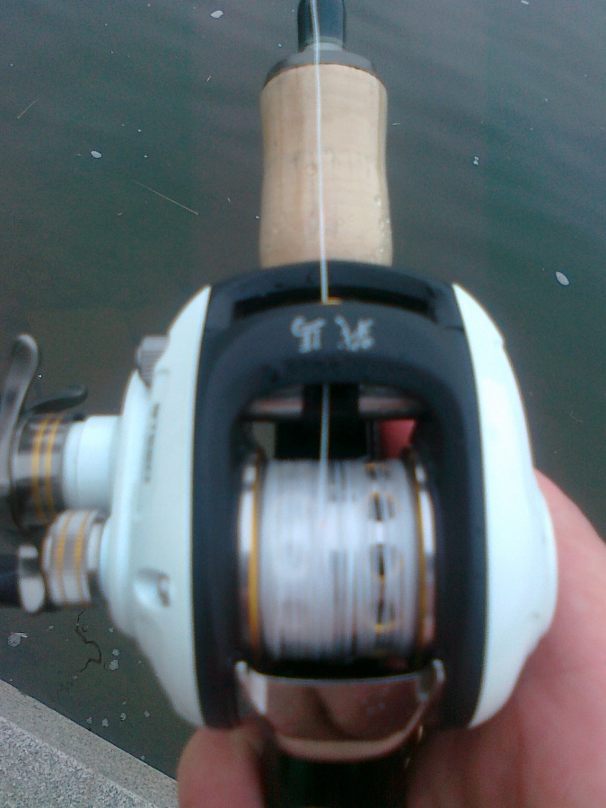 После недолгих настроек начинаю ловить. Забегая вперед, скажу, что в этот день никто ничего не словил (и не мы одни). На мелкой шпуле намотан китайский шнур 8lb, похожий на Power Pro. Должен сказать, что катушка понимается очень быстро, и без какого либо напряга. Очень понравилась эргономика. Катушка на спиннинге располагается таким образом, что держа удилище курком между средним и безымянным пальцем, большой палец ложится на дужку катушки (очень удобно). Тестировал по забросу воблера. Интересовало насколько далеко полетят мелкие. Так вот летят. Воблер Pontoon 21 GreedyGuts 55SP-SR весом 4гр. улетал стабильно метров на 17-20, и это моей для него шваброй, которая из-за длинны и семью граммами плохо грузится. Катушкой кидается все. И недогруженная резина и джиг и червяк на веки (недалеко, но всё-таки). Джиг, не сильно вкладываясь, улетел на 45 метров (чебурашка 10гр. и рачок 2 дюйма).