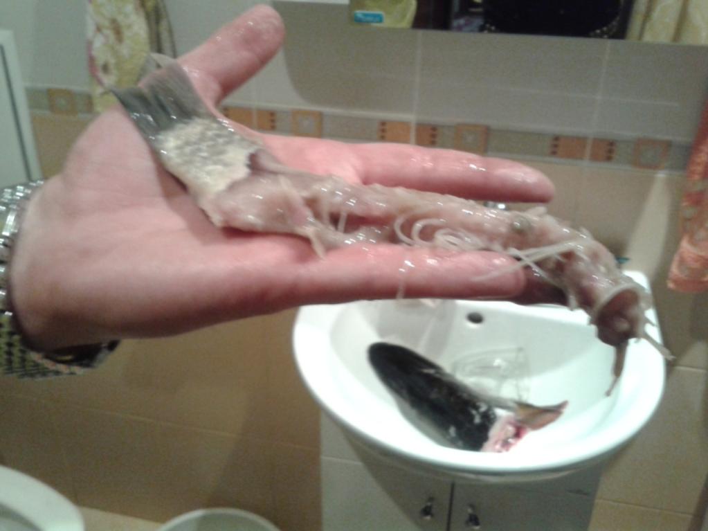 ID:	3659699Были с Каспером . Споймали на жерлицу , на 100 гр плотву . Когда извлекали крюк , четко было видно что шнурок был заглочен с хвоста ! На фото видно что плавники загнуты в сторону головы .