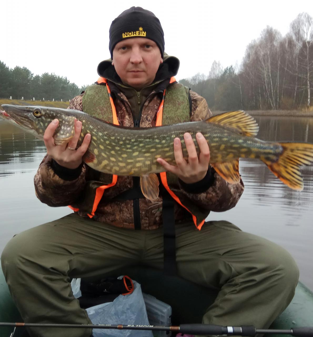 • Вчера с товарищем выбрались на один из водоемов Минской области в поисках щучки. Утренний туман, плавно перешедший в дневной, не предвещал ничего хорошего. С 09.00 до 12.00 полный ноль, лишь один недомерок около 300гр. Однако около 12.00 туман начал немного рассеиваться и озеро начало оживать. Как следствие последовали три поклевки. Щучки 700, 900 и 930гр. выловлены в течение часа. Около 16.00 за наше терпение последовала заслуженная награда в виде щуки 4.640. Домой уезжали на позитиве. Все поклевки на Рудру и Варуну (цвет Маттайгер), резина и железо Нажмите на изображение для увеличения.