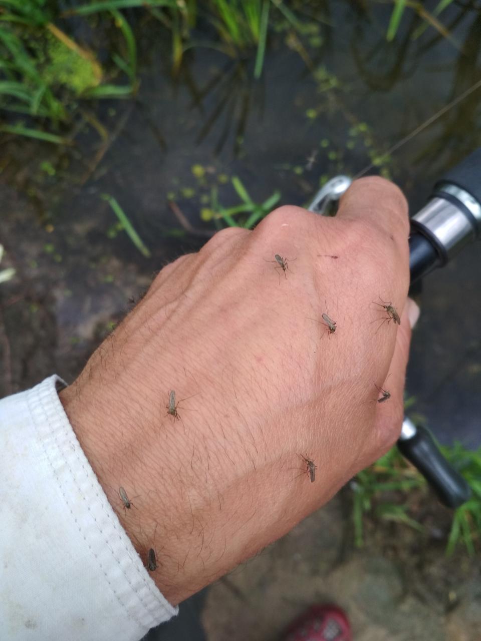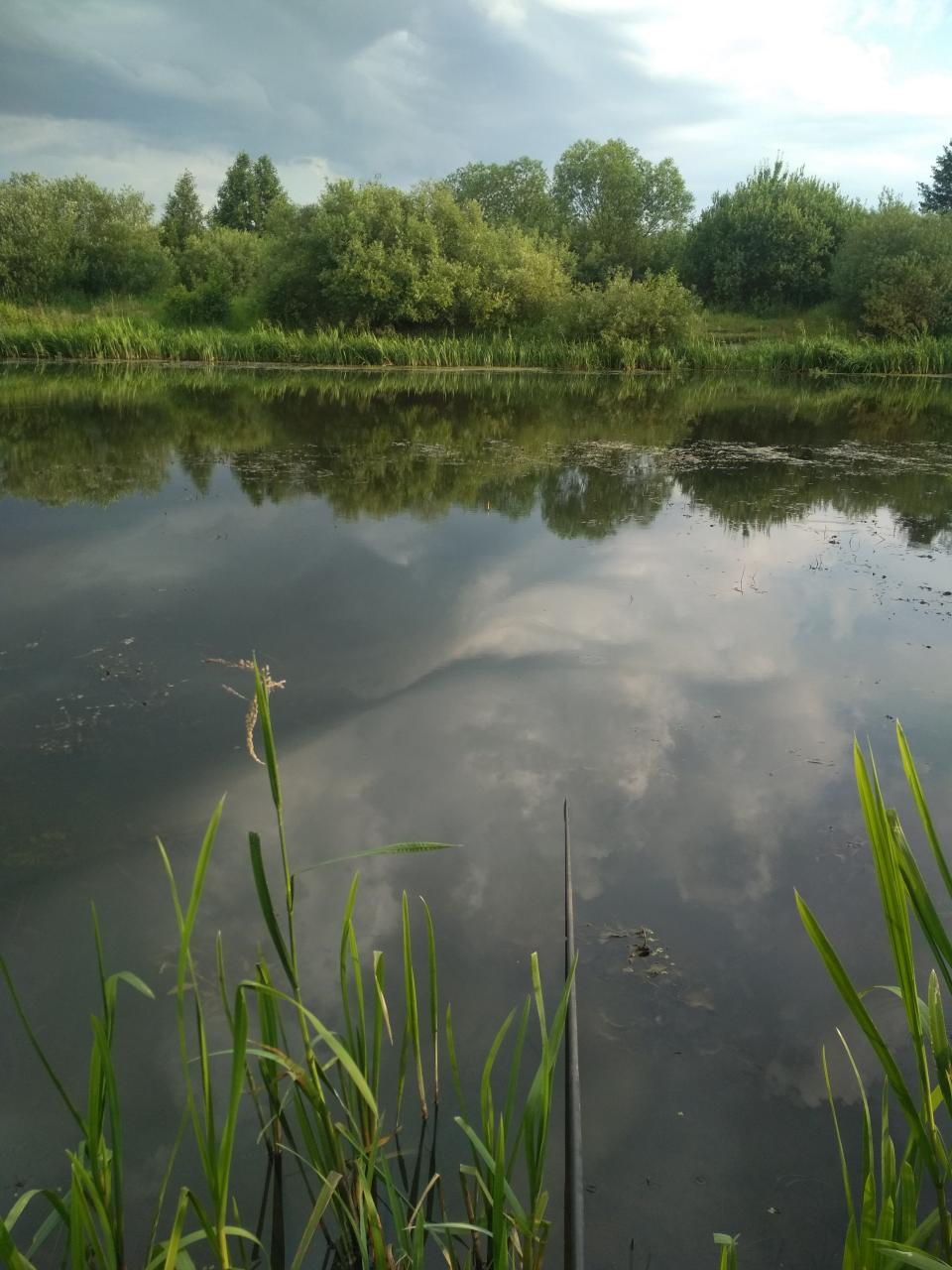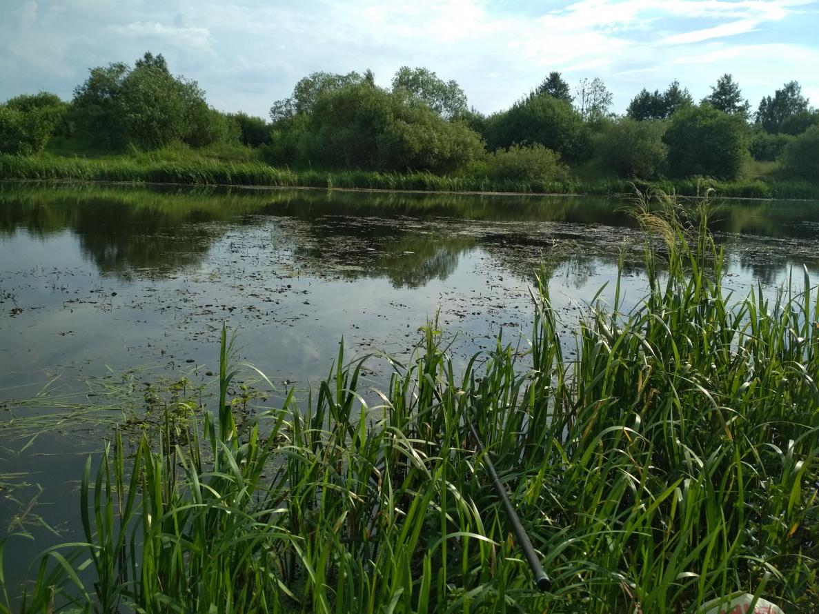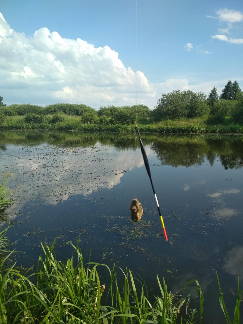 … Карася лучше ждать возле травы, у меня в жару, на чистом месте, его не было. От жары спасал зонт, а вот от слепней пришлось отмахиваться. За день выпита бутылка пива, с утра, и две по пол литра замороженные бутылки воды, растаяли только к полудню.