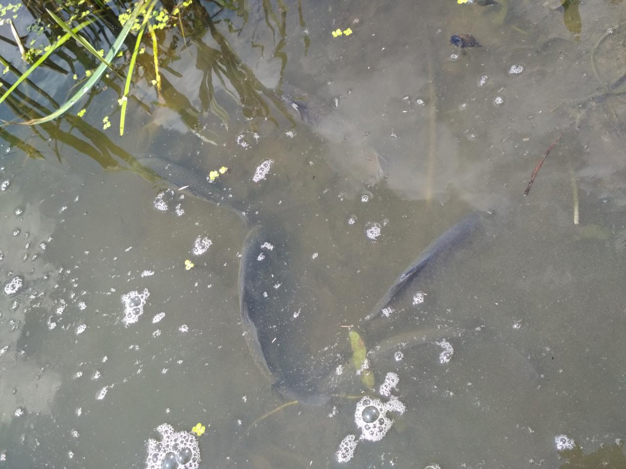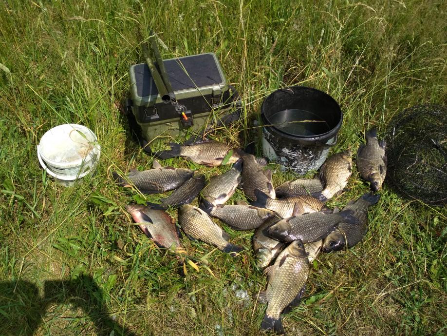Из снастей использовал 2 маховых удилища с тонкими оснастками. Глубина в точке ловли около 50 см, в небольшом чистом квадратике среди сплошного заросшего дна травою. Поклевки последовали практически сразу. Клев в течении дня набегами, карась хорошо отзывался на докорм, после очередного докорма активность поклевок спадала на ноль, а через 5-10 минут с новой силой восстанавливался, и так на протяжении всей рыбалки.