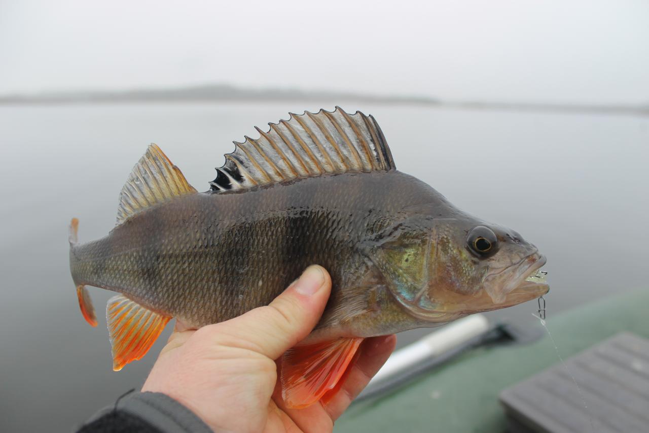 Посмотрев прогноз погоды решили, с другом по диагнозу, закрыться 24...25.12 ибо далее по прогнозу начиналась зима. Не смотря на сильный ветер и волну, с наветренного берега было относительно комфортно, защищал лес. На воду вышли только к 1200. Хорошо зная рельеф дна озера, окуня нашел довольно быстро, но уговорить на покушать резину пришлось постараться. Ну ни как он не хотел тратить калории в погоне за приманкой. Работала только такая проводка. При медленном волочении приманки (чебурашка, офсет, релакс копыто 3) по дну с паузами 4...6 секунд. Когда на паузе при натянутом шнуре следовала едва заметная потяжечка, нужно было сделать пол или один медленный оборот катушки, затем подать кончик спиннинга от себя до провисания шнура, тогда он (окунь) начинает медленно зажевывать приманку, шнур натягивается и после этого следует делать подсечку, ну а дальше рок энд рол!!! Чем больше время на зажевывание, тем ближе приманка к анальному отверстию. Мой улов на фото. Самый больший 1230 г.