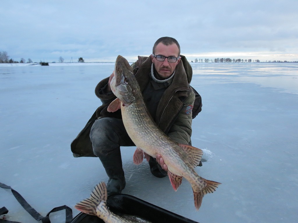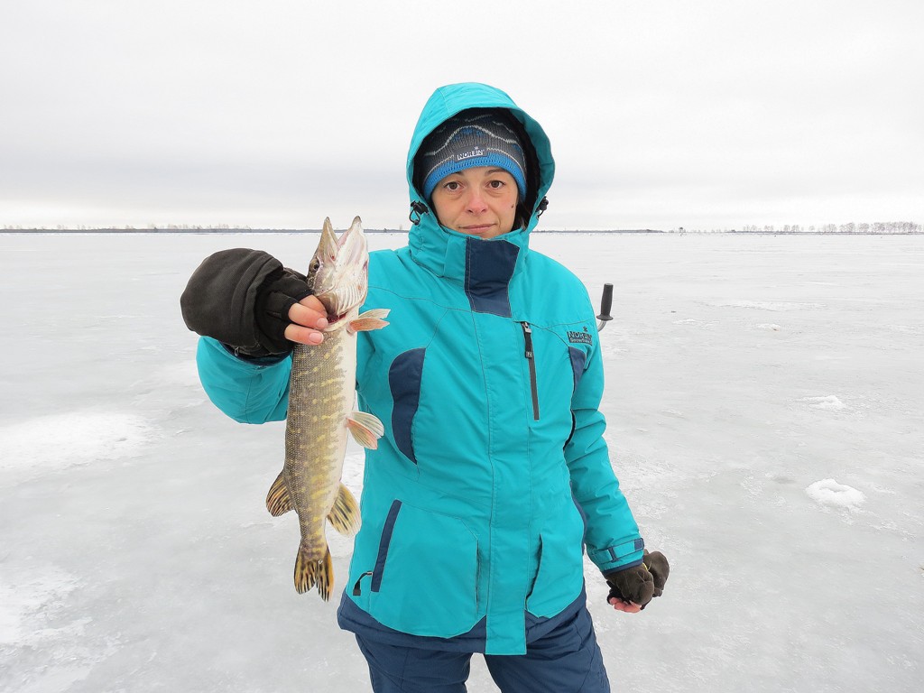 На завтра были на точке уже затемно. Пока приготовили снасти - начало светать. На точке ни души. Лунок тыща, ночью плюс, поэтому по тихому пяточкой продавливаем корку и блесну вниз. Окунь не заставил себя ждать - у Наташи сильнейшая поклёвка, короткая борьба, потом удар окуня об лунку и короткий "бздынь" лески - ушёл с блесной.:( Быстро перевязывается и опять макать блесну. Вскоре вторая такая же поклёвка, опять борьба и снова "бздынь" - опять ушёл с блесной.:( Вот это невезуха. И тут опять вездесущие местные - обступили, обсверлили, и окунь затаился. Надо сказать что в этот день окунь вообще клевать отказался. Местные пытались уговаривать его мормышками, но даже на мормышки были в основном редкие поклёвки со сходами у лунки. Иногда влетал залётный на балансир, балду или мормышку. Но включений клёва и закономерности не было - как говорится полный коматоз. Но Наташа и здесь отличилась - завалила щуку не окунёвую блесну.:D