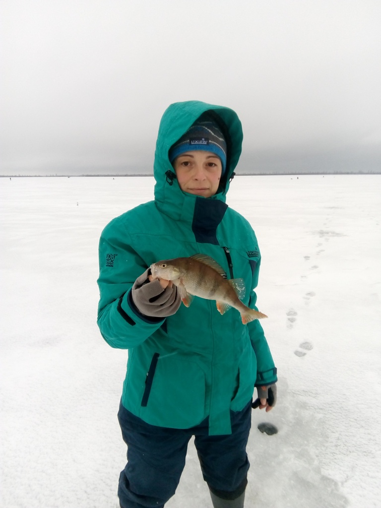 Дорога туда была очень сложной - сильный снегопад, заметённые дороги, плохая видимость, но слава богу добрались без проблем. Думали в будний день будет народу поменьше, но не тут то было - народу тьма. Выгрузились, включили навигатор и в путь. Пробрались через минно-ставочные заграждения, протопали 1,5 км. и вот мы на месте. На удивление мы одни на точке, но весь лёд как решето.:) Забурили две серии лунок и макать блёсны. Начать решили именно с блёсен. Как и следовало ожидать, первая окуня нащупала Наташа - стоял в небольшом приямке на глубине 2,5 м.