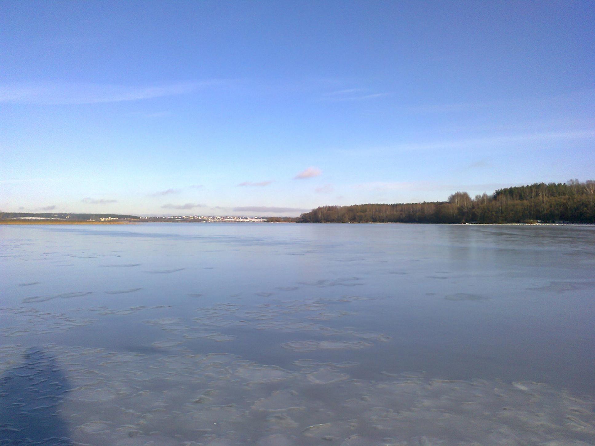 • Минское Море: лед от 10 до 15 см. Был в районе "краба" (Яхт-клуб) до 500 метров от берега, а также в районе слива дамбы. Лед белый, местами торосы, местами прозрачный, но везде прочный. На русла не совался, но народ и на них сидел. А вообще, людей очень мало для воскресного дня. Видимо, не поверили...