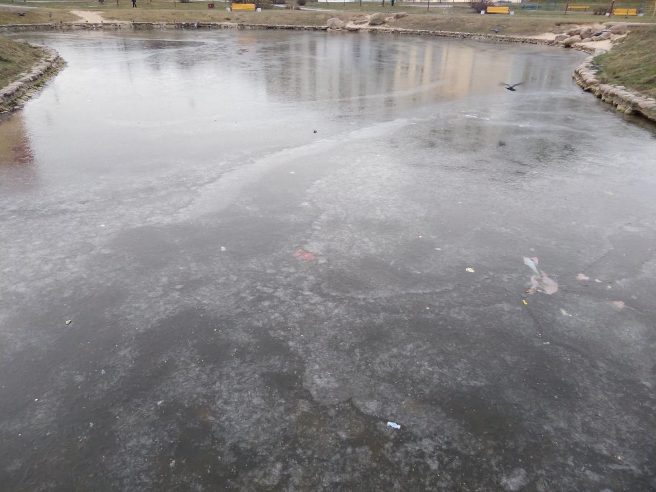 • Мухля на харьковской. Малое озерцо - лёд более см. Большое - пленка и то не везде... но не из за ветра. Случилось нашествие бешеных уток