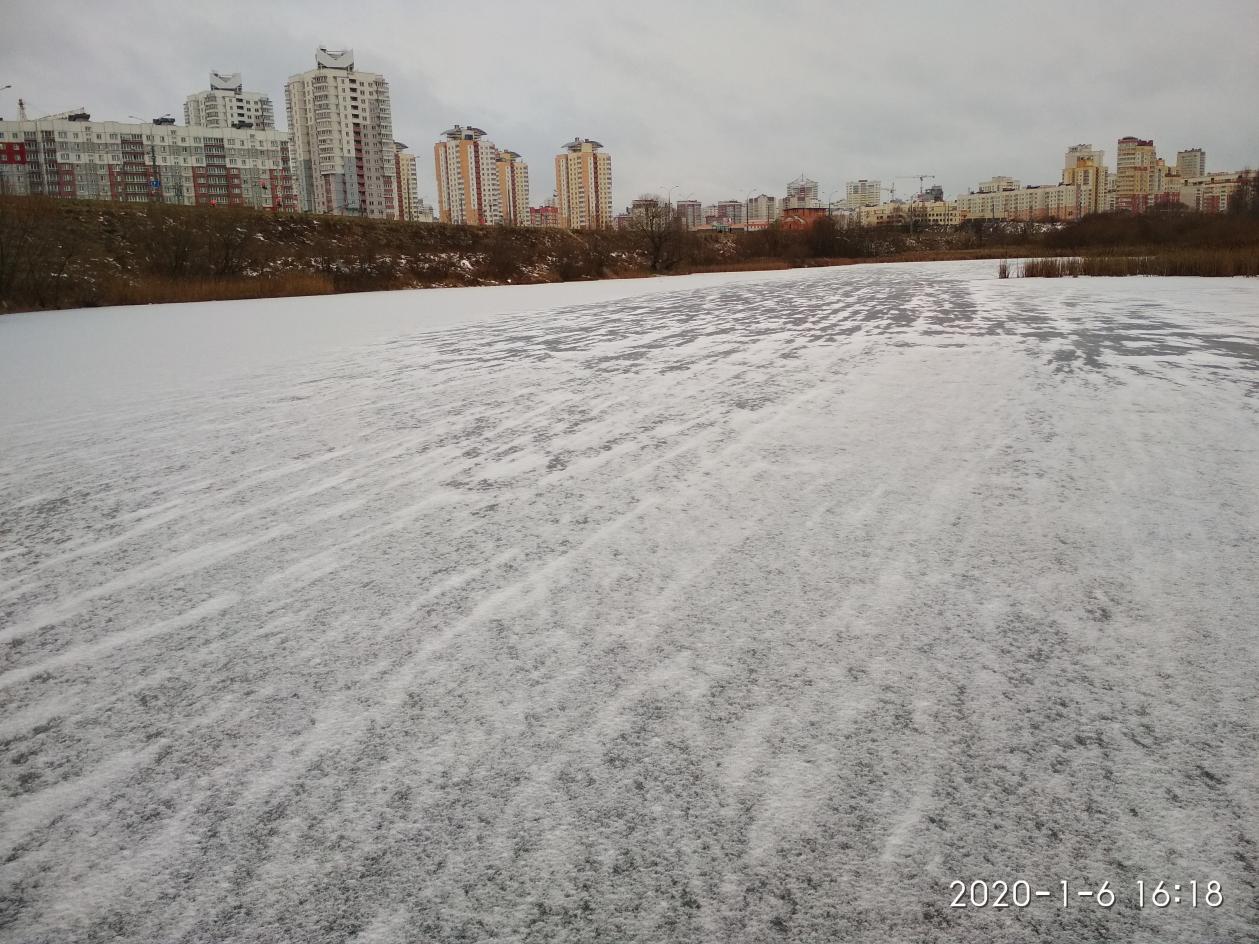 Минск,на Семашко вчера все затянуто, кроме одного места под берегом, лед 2.5 см. Сегодня промоина на месте, лед 5 см, походил , держит, почти не трещит. Вот такая динамика.