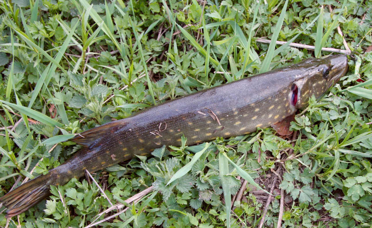 После подсечки две секунды что-то плывет на другом конце по течению (думаю - поднял какое-то бревно и оно плывет по течению), затем спиннинг в дугу, писк фрикциона и борьба; через 3 минуты щука на берегу. Взвешивание - 2100 гр.