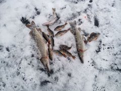 С утра было 4 выстрела из 10 ставок. Две подняли - две "почистили" карасиков , как скальпелем порезы и нихт. Постояли мы до 12 и наххауз. Пошел мелкий снежок. На улице -2.5. 12 щук в багажнике. Можно и домой