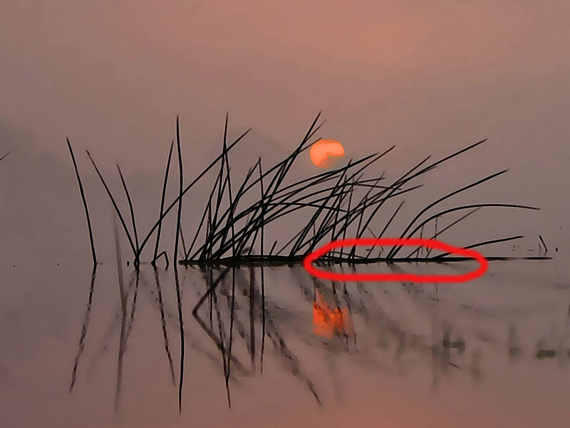 Я не менял композицию, предметы, цветовою гамму...Рассвет, туман, солнце, линия хвоща, очертания леса на противоположном берегу - всё совершенно естественно. Убраны некоторые хвощинки (но ничего не добавлено), добавлено насыщенности краскам солнца и естественная рябь обработана размытием, а контуры хвоща - штрихами. Это фсё. Почему та делаешь глобальный вывод об изменении действительности? Объясни?
