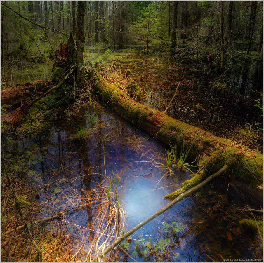 мне первый вариант больше по душе, наверное из-за отражения. Тут скорее виновата сама вода, стоячая болотная имеет слабо-различимую синеватую пленку, отсюда и холодный синеватый оттенок при отражении солнца.