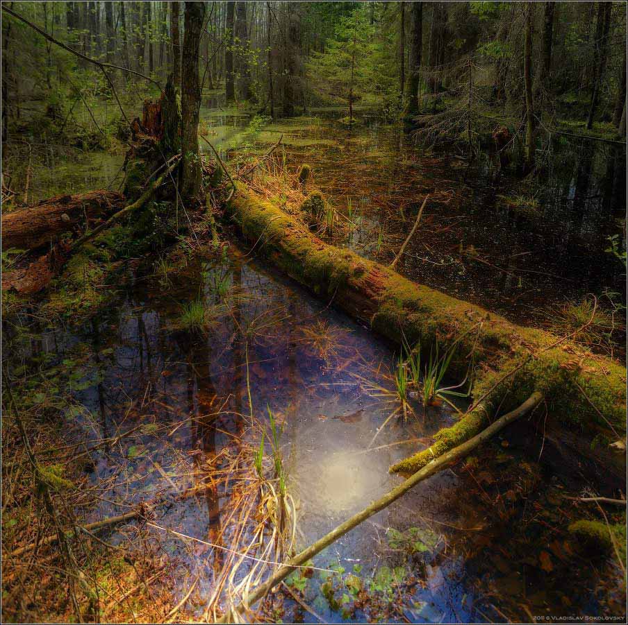 мне первый вариант больше по душе, наверное из-за отражения. Тут скорее виновата сама вода, стоячая болотная имеет слабо-различимую синеватую пленку, отсюда и холодный синеватый оттенок при отражении солнца.