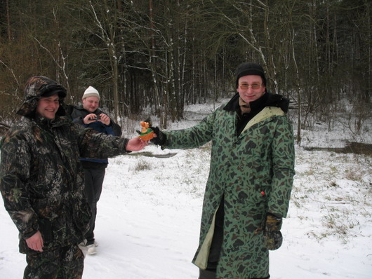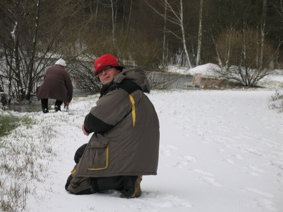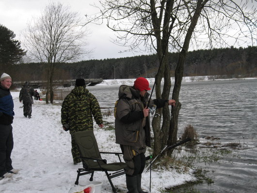 Я лично не рискнул и радостно пополнил группу болельщиков. Все кто хотел разместился и рыбалка началась. Сильный ветер и снег ( временами ), сделали свое черное дело. Поступило предложение скинуться и съездить за шашалыком. Поехали. Приехали. Пообщались. И тут случилось самое интересное. Радостный крик Ажгура - "подсак". Думали подкалывает, ан нет действительно прет. Организовали подсак - Петр принес. Начали доставать. Карп!!! :o Да еще какой килограмма под два. Ну Саша отличился, а ведь до этого на фестах в основном "сомов в очках ловил".;)
