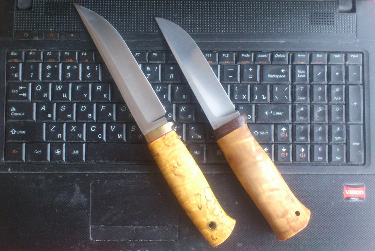 • Сделал парочку не так давно. Поковки от Егора, спасибо большое. Долго лежали. )) Кованая ШХ-15, 115х29х5мм. рукоять-орех,(Мартовский кот подогнал, спасибо Василий ) латунь, чёрный картон, белый пластик. Правый-кованная ШХ-15, 110х26х4 мм., рукоять карельская берёза, берёзовая сувель, латунь. титан, чёрный картон.Нажмите на изображение для увеличения.