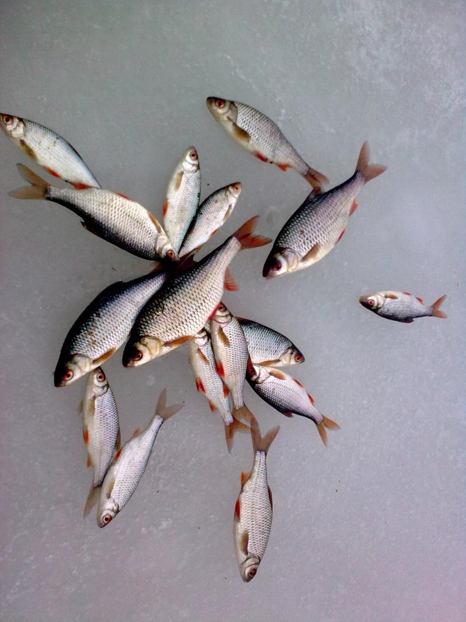 Рыбка ловилась на мотыль. Чтоб стала активней, приходилось подыгрывать. Ловилась исключительно на старых лунках. Свежезабуренные все молчали. Обошли 20-25 лунок. Где с лунки одна, где две рыбки, а где ничего. Может из-за маленькой глубины и рыба боялась бура? (глубина метр-полтора). Колючка практически не донимала. На озере рыбаков человек под сорок, но никто не пишет.