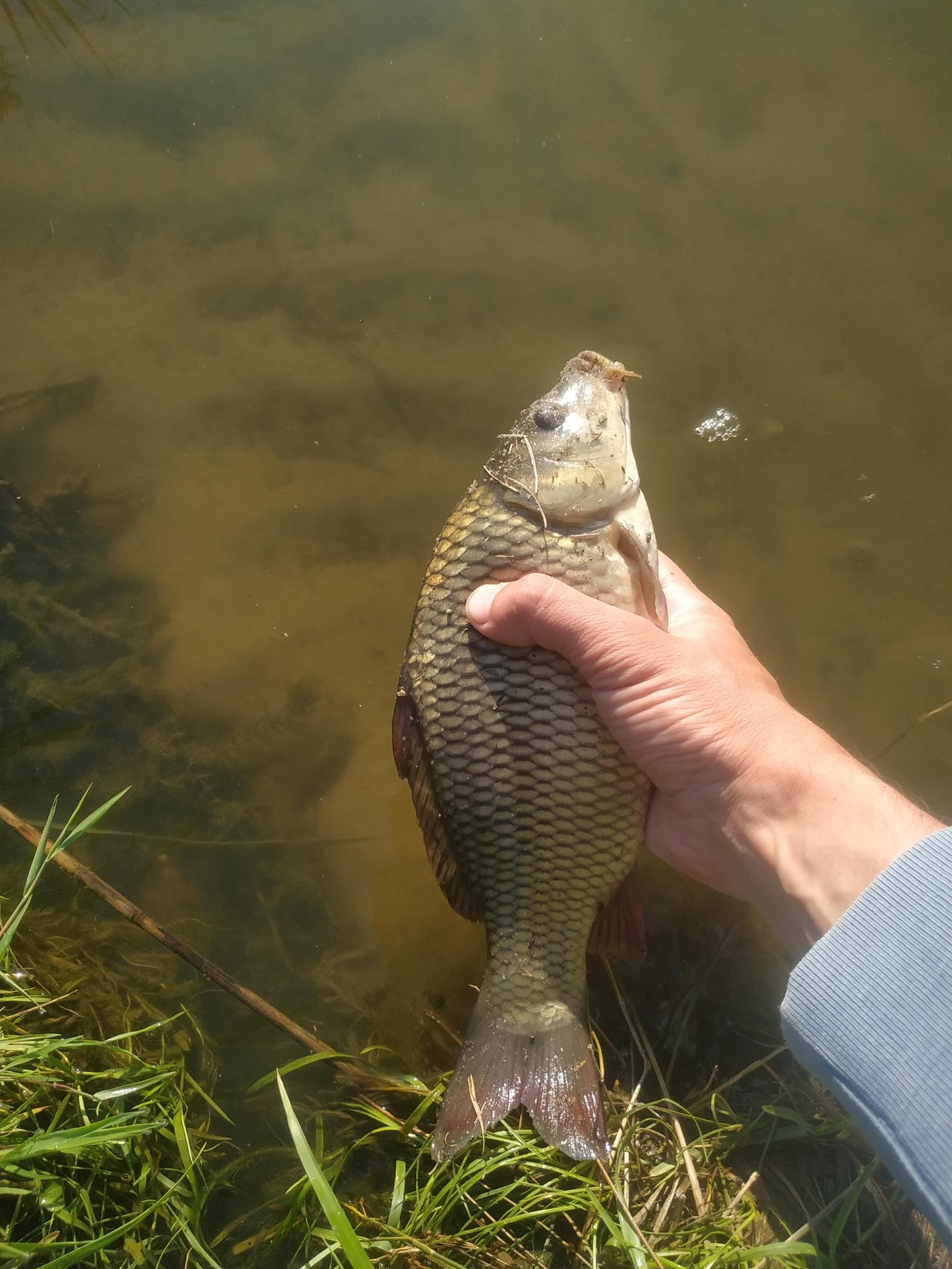 Пока мальки делали моим ногам пилинг, в садок попало штук 7 карасей 70-120г и пяток плотвиц. Еще штук 6 карасиков отпущены по малолетству.