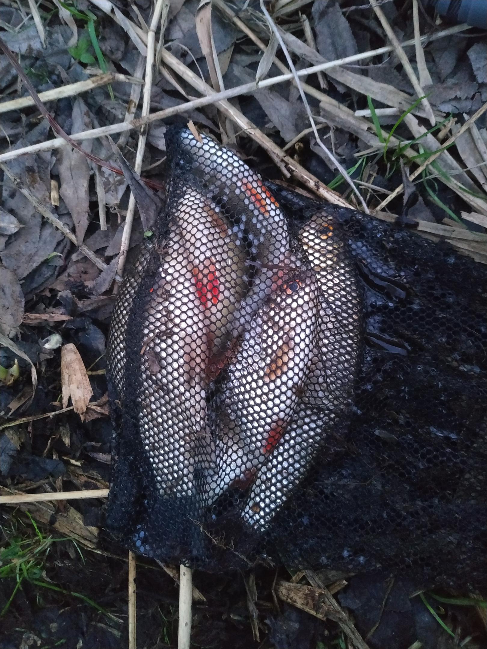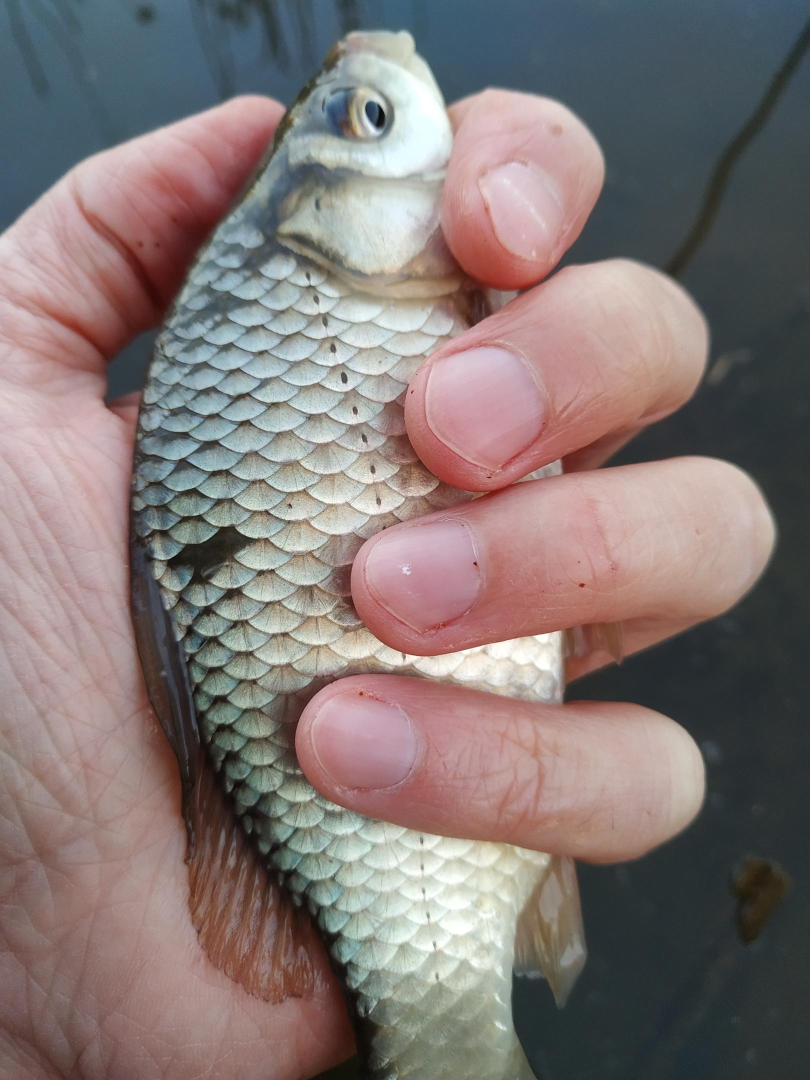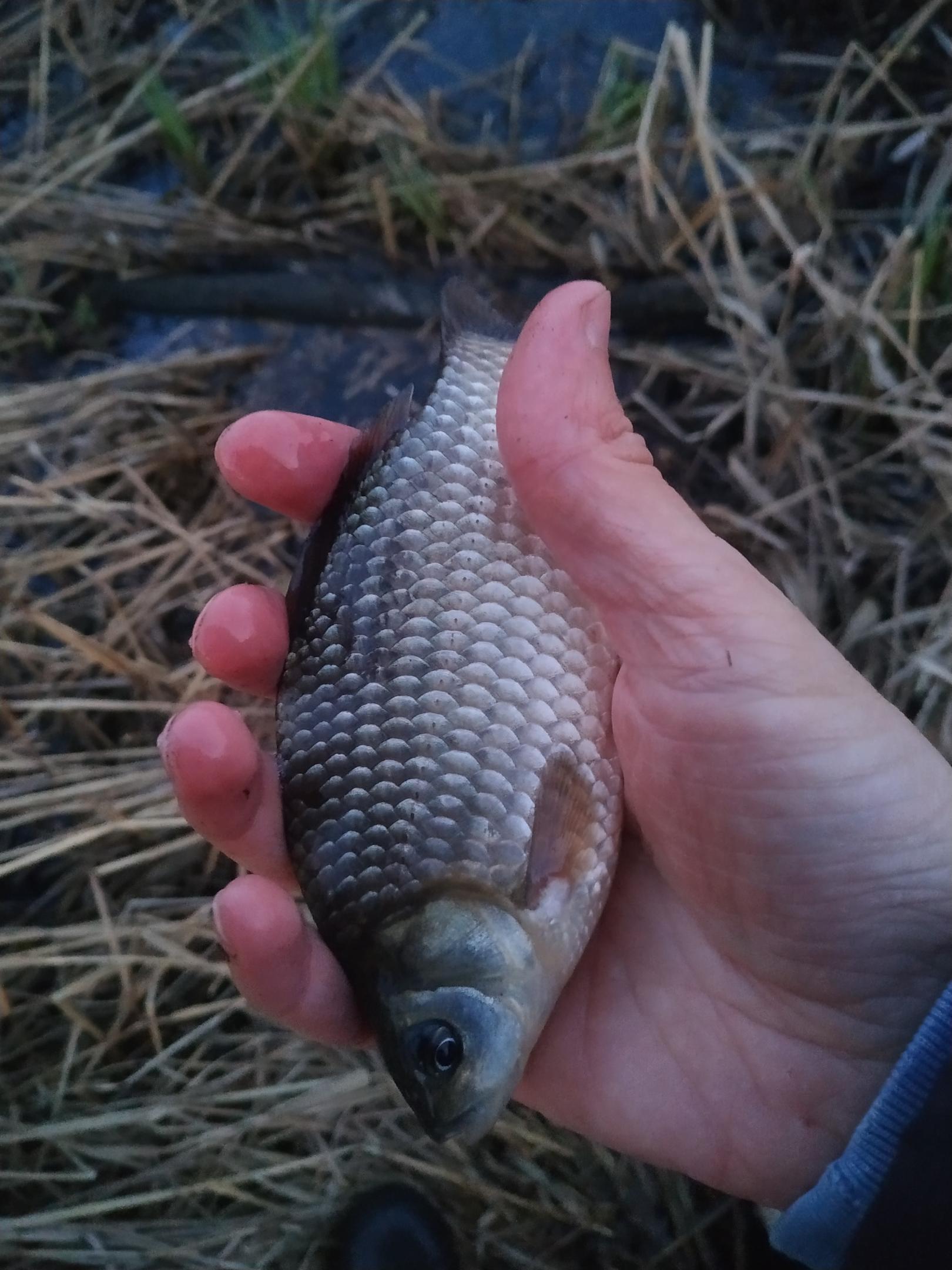 Выхода так и не случилось, но несколько поклевок реализовать удалось. Карасик сегодня небольшой, около 100г. В садок попало 4 штуки, в конце я их отпустил.