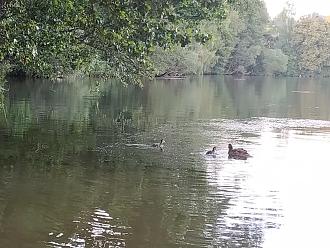 Под берегом копошатся утки, одна запоздалая, с парой совсем маленьких утят.