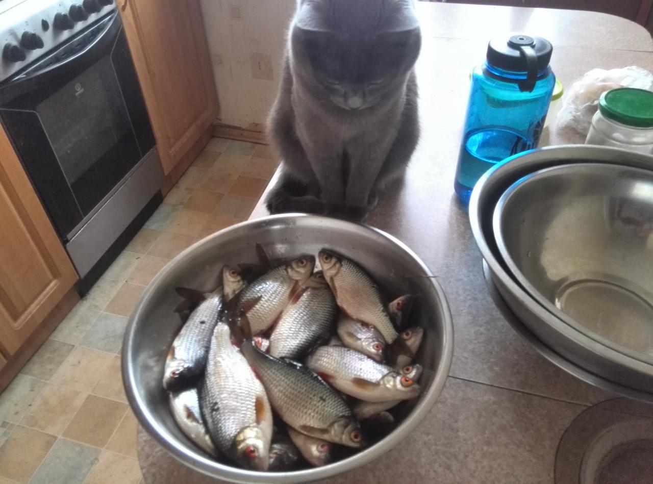 Василиса всегда встречает с рыбалки,берёт пакет,раскладывает по тазикам.что жарить,что солить:D.Помощница. Жаль сама рыбку не ест.