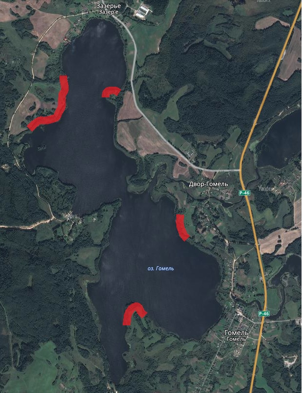 Тихо и спокойно там в плохую погоду. Когда жарко и теплая вода - днем много и отдыхающих, и рыбаков, особенно в выходные. Отметил примерно места, где обычно видел резиночников и фидеристов: