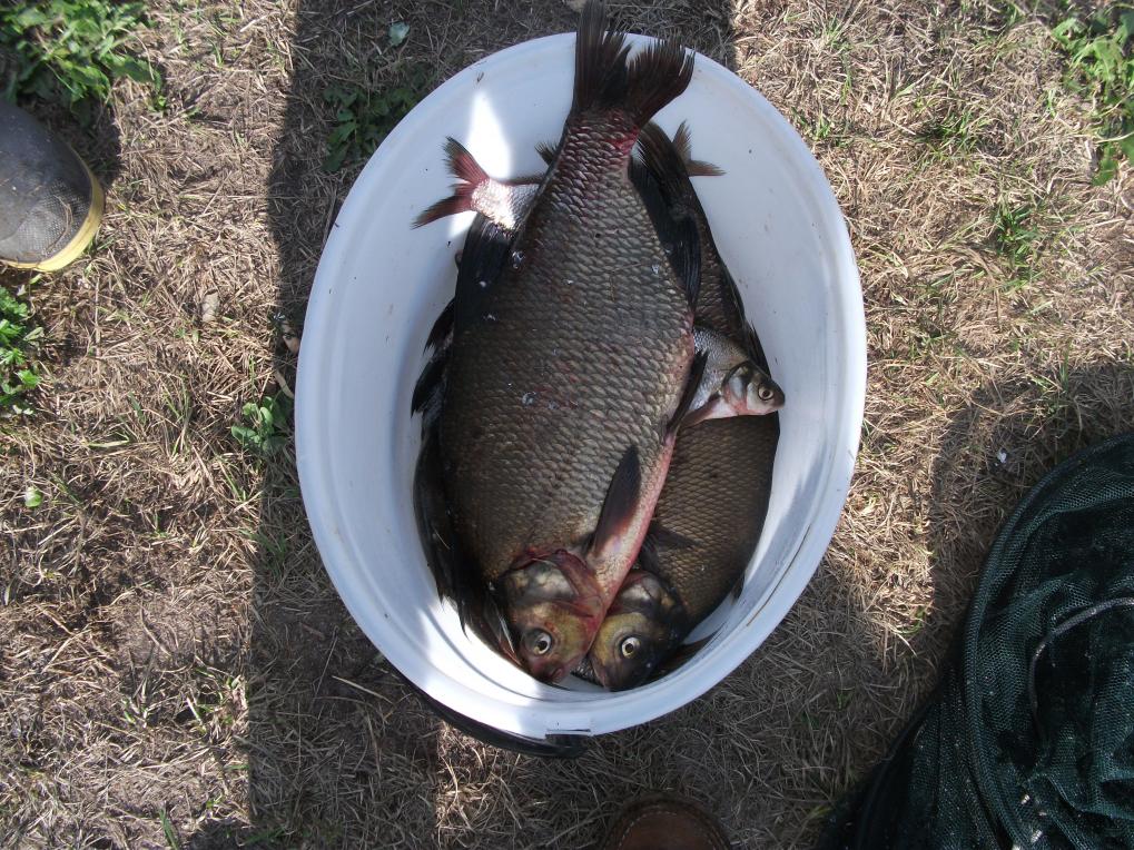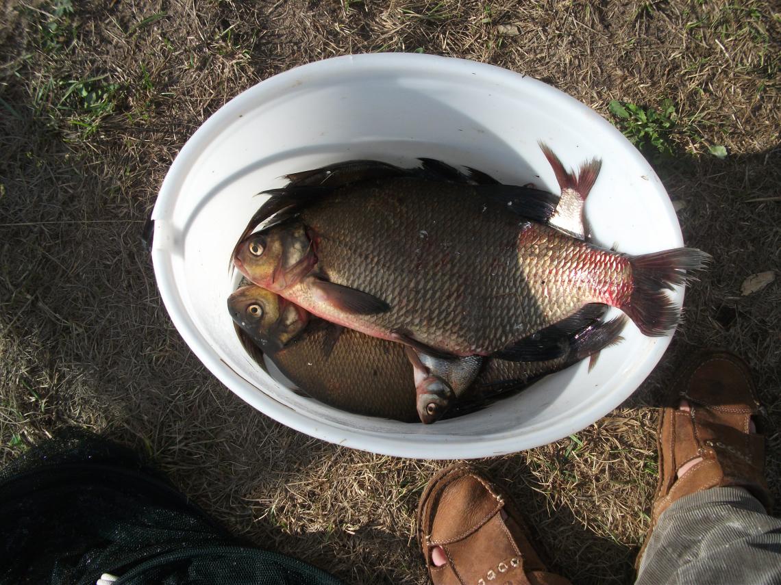 Приехали пораньше. В 5.30 на воде, решили ловить на 7 метрах, на бортовухи. Цель лещ. За кормились, сидим, ждем поклевки. Штиль, вода аж кипит вокруг лодки от пузырей( видать рыба кормится).;) И тут в метрах пяти от лодки делает свечу в 1,5 метра щука на вскидку 3кг, картинка супер. А дальше, еще веселее, прямо у лодки всплывает лещ киля на 2 и неохотно в развалочку, переваливаясь с бока на бок делает заплыв метров на пять по правому борту лодки:o:o:o Мы с друганом в шоке , я бы сказал даже в ступоре, все кругом красиво , а на удочки не клюе. Достал мах и в пол воды на поплавок с матылем на крючке, тоже тишина.Сидим час , тишина. Все кругом бурлит , рыба гуляет, а наши прысмаки в игноре. После двух часов ожидания, переплываем на 4 метра, поближе к своим летним прикормленным местам. Я не попал в клев и на четверке, а друган на 3,5 встал и после прикорма подошел лещ. Первого он взял килошника , через несколько минут , еще одного. Я долго не думая к нему, ловим в месте, и через пару минут у меня в садке килошник. Стало веселее, от нуля ушли.:)Достаю тайное оружие сладкую кукурузу фирмы "БОНДЮЭЛЬ", и у меня лезет в садок 1,200. Делюсь с друганом кукурузой , буквально с первым забросом у него 2,300. Я в догонку беру подлещика на 650 гр, ну все поперло, ан нет??? Как пришел , так и ушел лещик, клев обрезало напрочь. Посидели еще часок, хотели переплыть поискать лещика, да поднялся ветрила приличный. Решено домой.Вот такая получилась рыбалочка, рыбы не много, но зачетная.