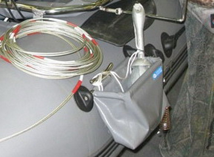 • Своеобразное и довольно оригинальное решение по устройству сумки для якоря. Сумка с якорем находится за бортом лодки, съемная (при сдутой лодке). Только не совсем понятно как она поведет себя на глиссере.