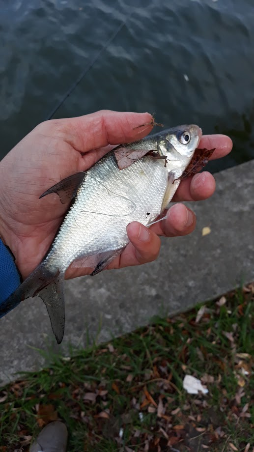 На место прибыл не торопясь примерно в 6:20. Двое рыболовов видимо сидели ночь. Промер дна занял у меня еще минут 20. Мелко там все таки. Решил кидать делеко, но в русло. Глубина около 2,5м там. Сначала клевало слабо, однако где то к 8:30 удалось раскормить точку и мелкий подлещ стал клевать на каждом забросе в темпе 3-4 минуты вот такого размера.К этому времени рыбак который был поближе и справа уже ушел, а я расчехлил второй фидер и стал бросать почти в ту точку где ловил он (там ракушка посреди ила). На перловку туда только успевал забрасывать - плотва с указательный палец на каждом забросе через 20 сек. Даже думал второй фидер убрать.
