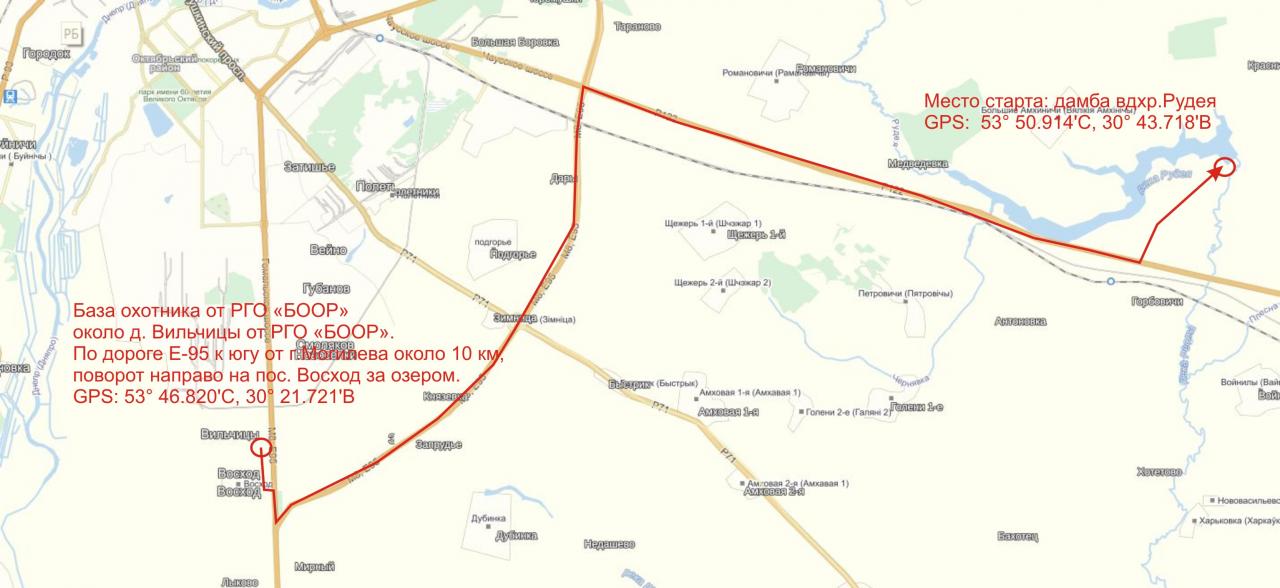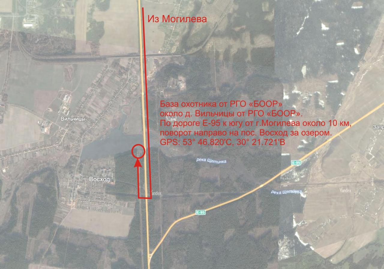 Проживание: База охотника от РГО «БООР» около д. Вильчицы от РГО «БООР». По дороге Е-95 к югу от г.Могилева около 10 км, поворот направо на пос. Восход за озером.