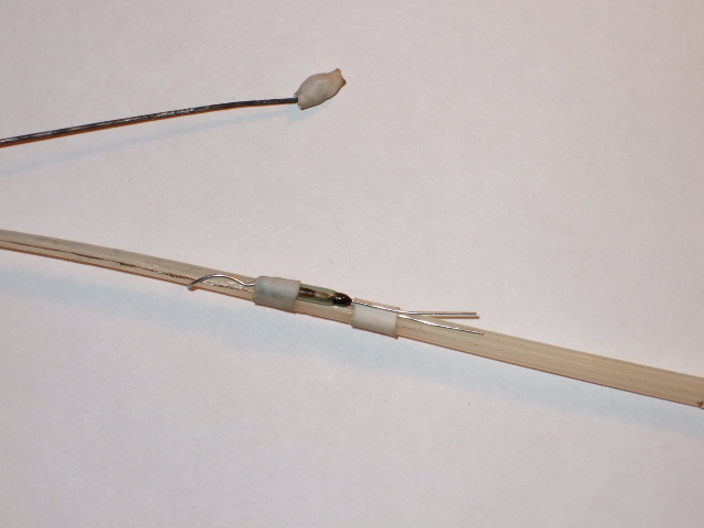 • Прикрепил купленный геркон, раздробил кусочек неодимового магнита и обтянул его термоусадкой. При удалении магнита геркон замыкается, при нахождении рядом - размыкается. Попробую сделать на герконе. Всё же так повторяемость удочки будет на много больше чем с датчиком хола, если кто-то решиться собрать подобным образом.Нажмите на изображение для увеличения.