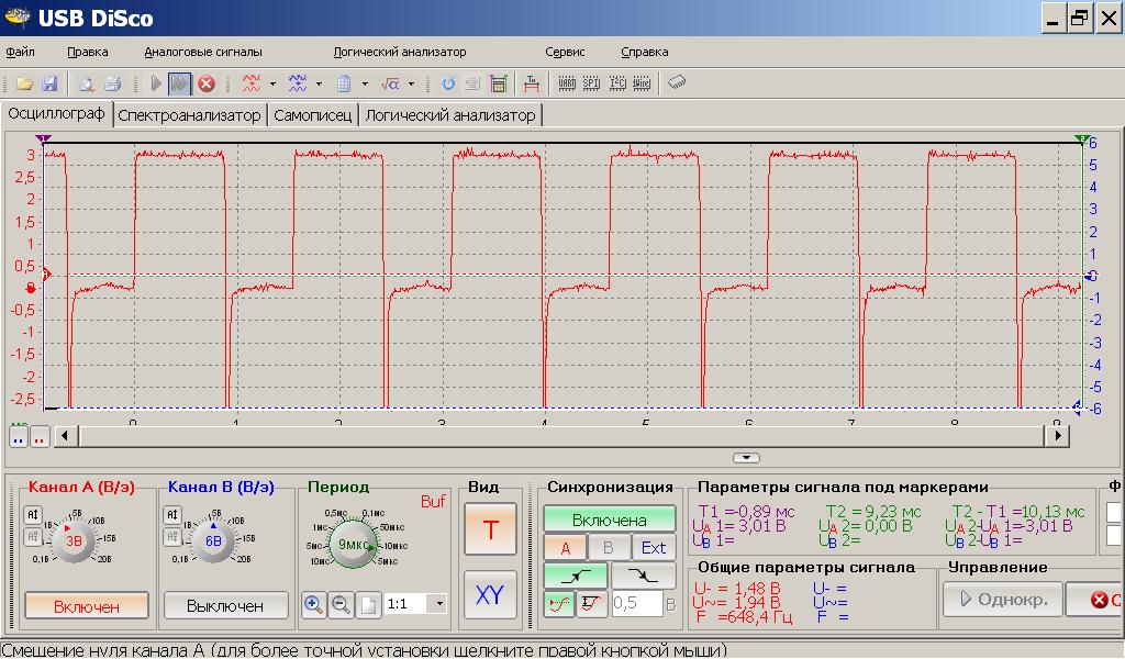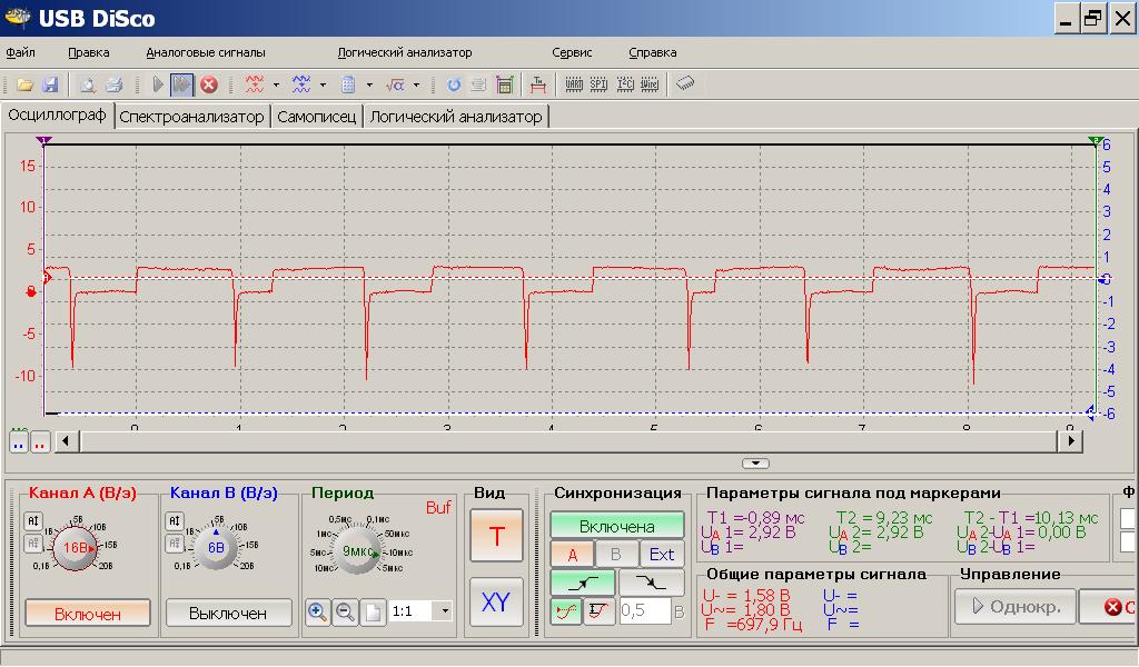 осциллограммы на динамике при трёх вольтах питания схемы. Конденсаторы взял ёмкостью 0,1мкф а не 0,01мкф, таким обазом снизил частоту пищания и увеличил её громкость. Частота гудения 650 герц. Есть отрицательные иглы ЭДС самоиндукции на динамике (динамик - это же катушка), нехорошо... попробую поставить диод в параллель, надеюсь звук тише не станет.